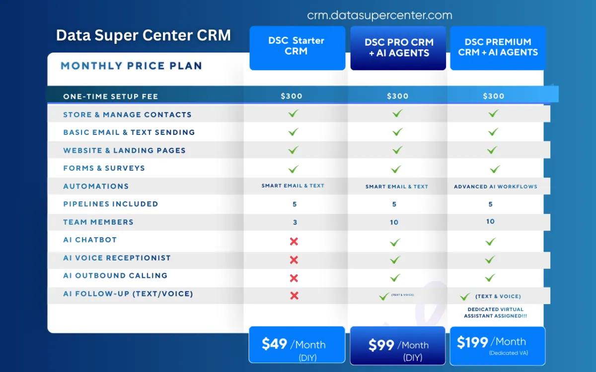 Data Super Center CRM (DSC-CRM) is a powerful, all-in-one customer relationship management platform designed to help small businesses automate everything — from lead capture to closing the sale.